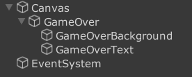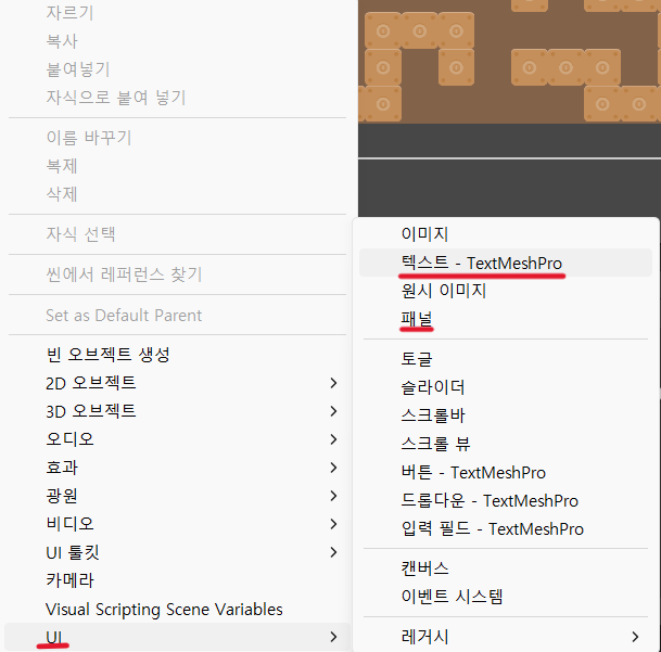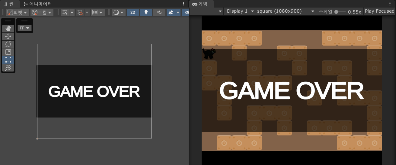 게임 오버 장면은 패널(배경)과 텍스트를 통해 만듭니다.