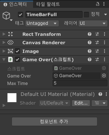 스크립트를 TimeBarFull에 적용 후 GameObject를 GameOver 폴더로 설정해줍니다.