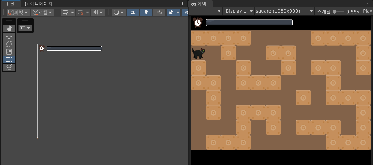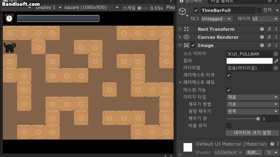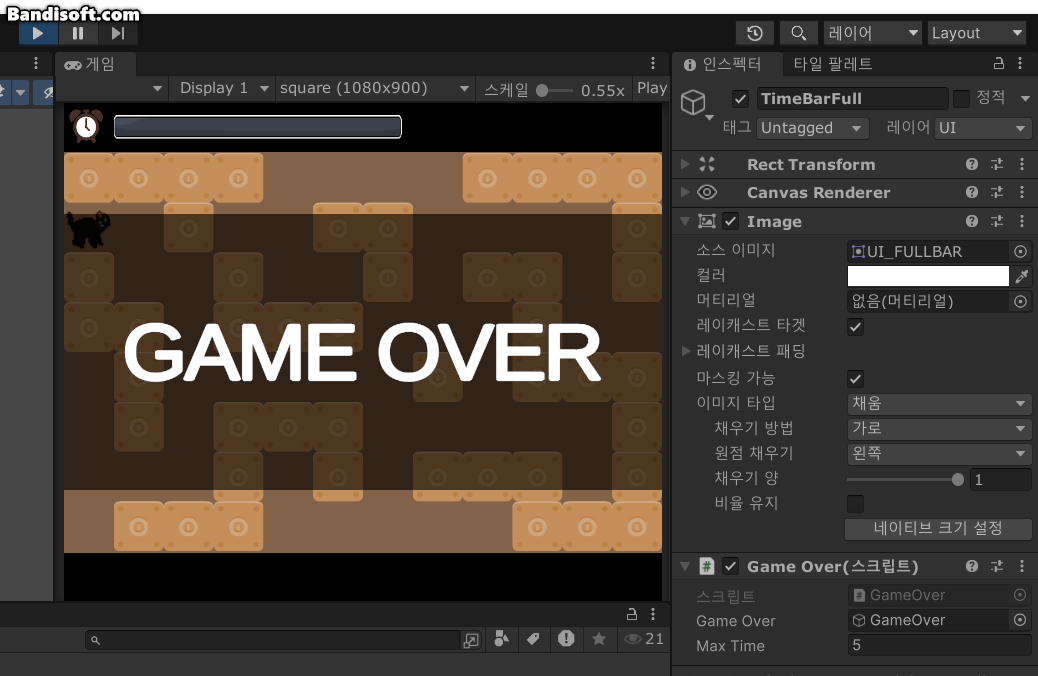 타이머(Bar 형식)와 시간이 다 되면 나타나는 게임 오버 장면까지 만들겠습니다.