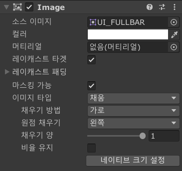 타임바가 줄어들게 하는 설정은 TimeBarFull 이미지 타입을 채움(Filled)로 설정해주면 됩니다.