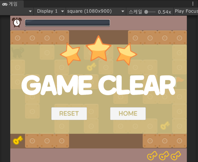 키를 전부 얻고 골 지점에 도착하면 클리어 화면이 띄워지게 됩니다.
