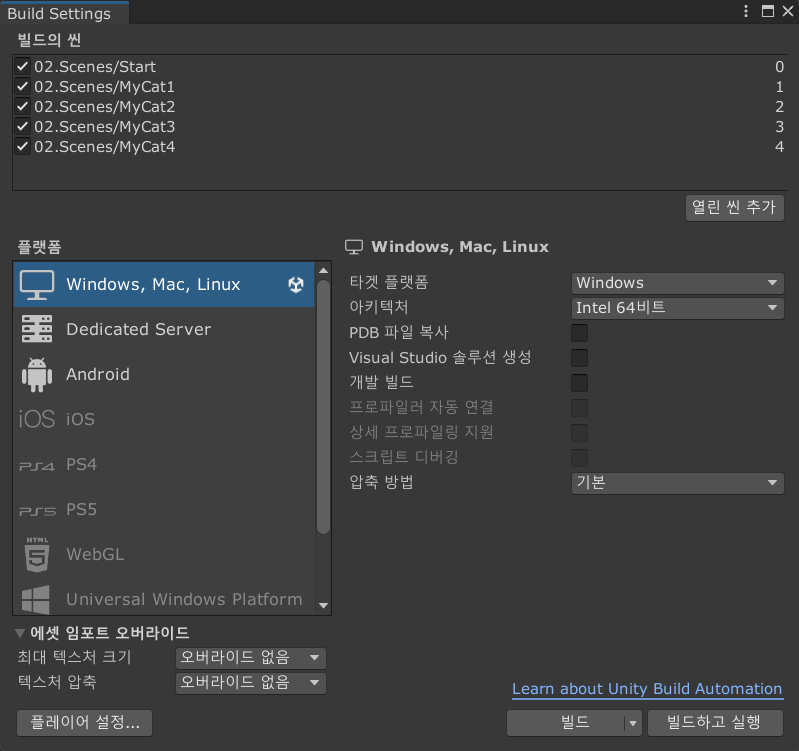 - '파일 > 빌드설정' 에서 게임에 필요한 씬을 순서대로 추가 (체크 필수)