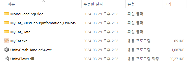 빌드 완료 후 선택한 폴더를 확인하면 게임 파일이 생성된 것을 볼 수 있습니다.
