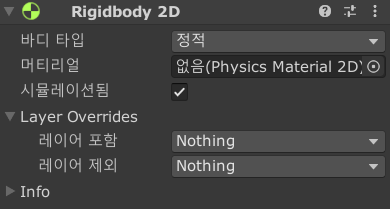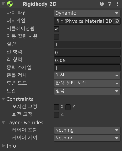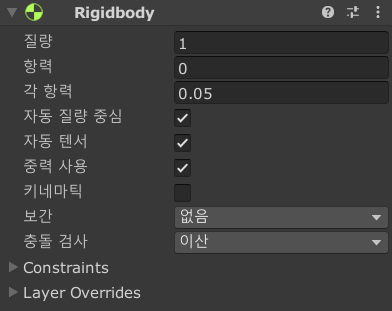Layer Overrides | 다른 콜라이더 2D와의 충돌 여부를 결정할 때 이 리지드바디 2D에 연결된 모든 콜라이더 2D가 포함/제외해야 하는 추가 레이어 선택 |