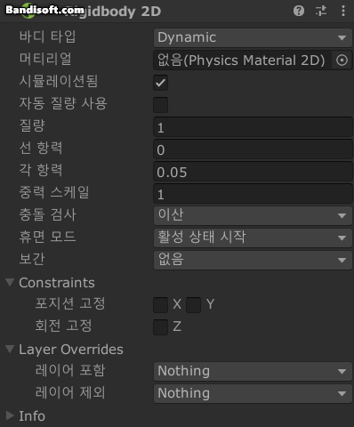 Constraints | 리지드바디 2D의 움직임에 대한 제약사항 정의 (포지션 고정, 회전 고정) |