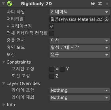 시뮬레이션됨(Simulated) | 리지드바디 2D 및 연결된 모든 콜라이더 2D와 조인트 2D가 런타임에 물리 시뮬레이션과 상호작용 여부 결정 |