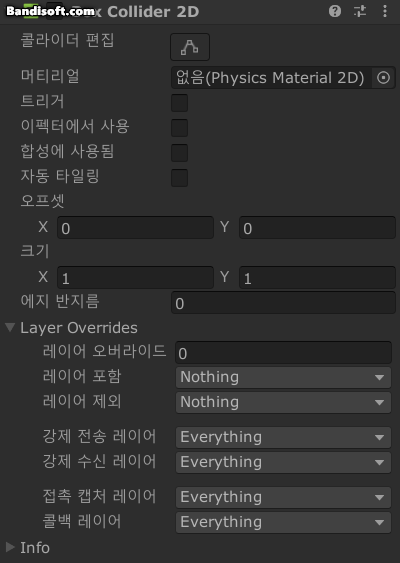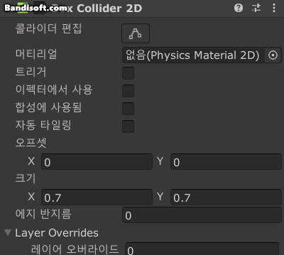 콜라이더 2D가 트리거처럼 작동 (물리 시스템은 콜라이더 2D를 무시) - 이 옵션을 활성화하면 '강제 전송 레이어', '강제 수신 레이어' 옵션이 사라짐 |
